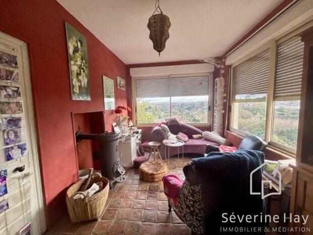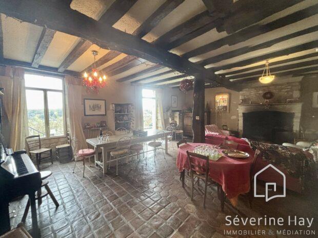 La cuisine s’ouvre sur un salon largement vitré, avec vue panoramique sur Chauvigny, doté de tomettes anciennes et d’un poêle à bois.