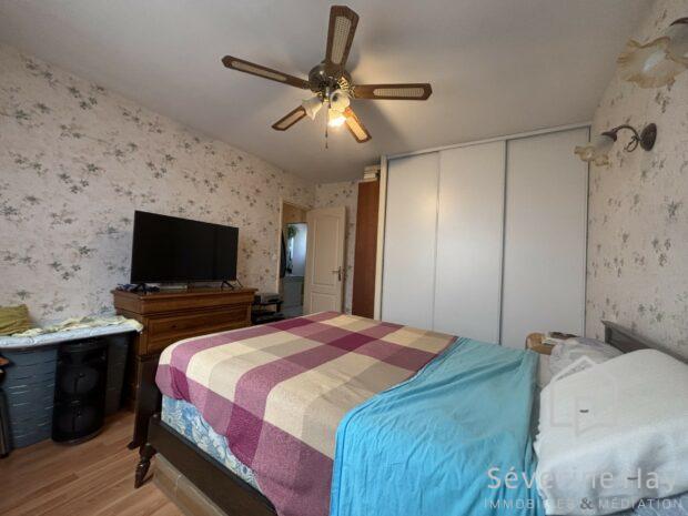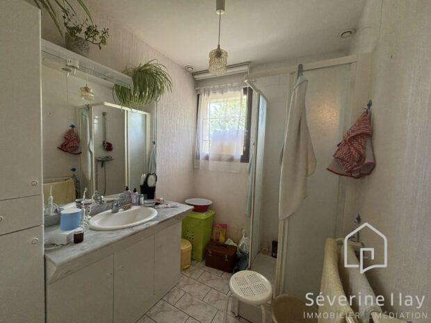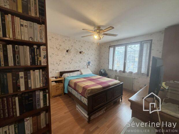 Un dégagement mène à 3 chambres avec placards intégrés à portes coulissantes, des WC et une salle de bains. Un cellier à l’arrière, avec un abris bois dans son prolongement. Un terrain de plus de 350 m² à l’arrière avec au fond du terrain, un autre abris.
