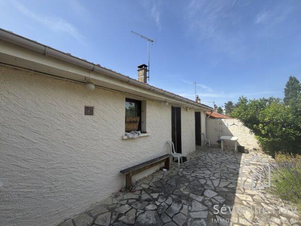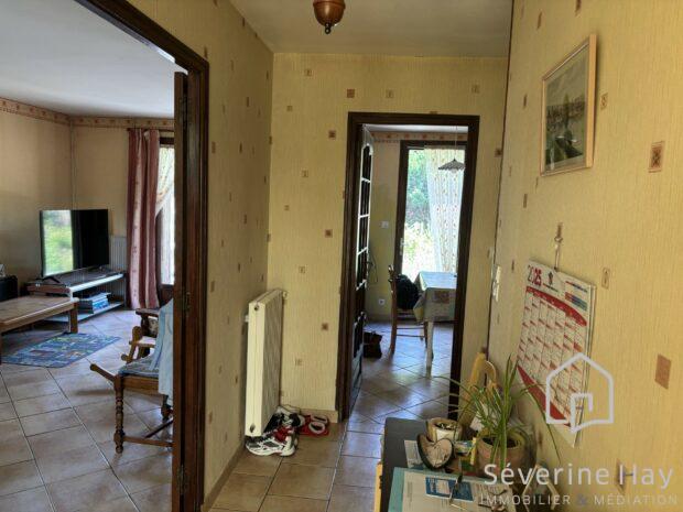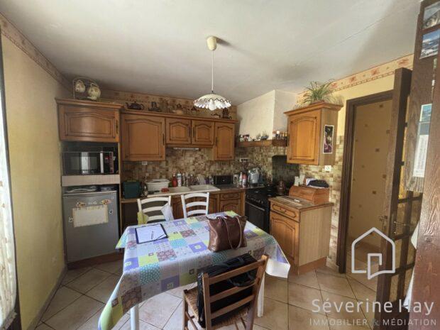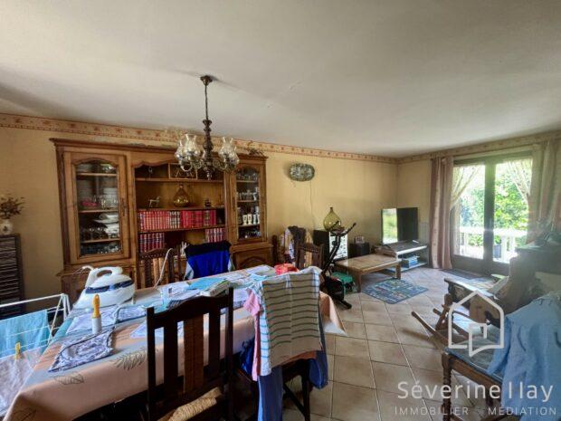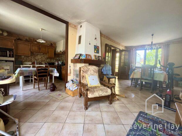 Description : Véranda, entrée avec placard, cuisine aménagée donnant sur le séjour/salon avec une cheminée insert et double porte-fenêtre donnant accès à la terrasse, une autre porte fenêtre dans la cuisine donne accès au terrain.