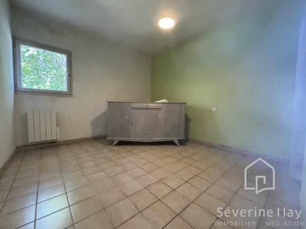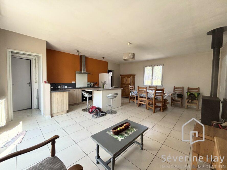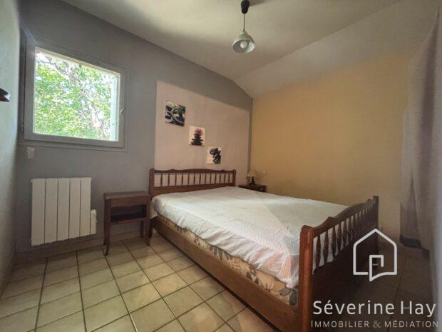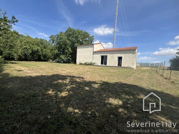 * La maison de 1990, comprend: un séjour-salon avec cuisine ouverte aménagée et équipée (plus de 30 m²), baies vitrées donnant accès direct au jardin avec volets roulants électriques. Une chambre de 11 m² au rez-de-chaussée, salle d’eau et WC.